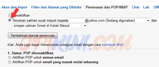 - Langkah berikutnya adalah mengaktifkan fitur auto forward tersebut dengan cara pilih lagi tab Penerusan dan POP/IMAP kemudian pilih Teruskan salinan surat masuk kepada dan jangan lupa klik tombol Simpan Perubahan.
