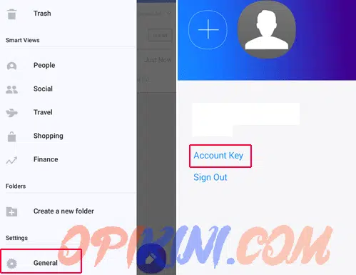 - Kemudian pilih Menu – scroll ke bawah dan pilih General lalu pilih Manage Accounts – Account Key.